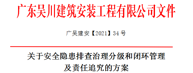 為建立安全隱患排查治理長效機制,強化安全生產主體責任,加強安全隱患治理,防止和杜絕事故發生,保障施工項目的安全生產,現結合公司的實際,特制定安全隱患排查治理分級和閉環管理及責任追究的方案。