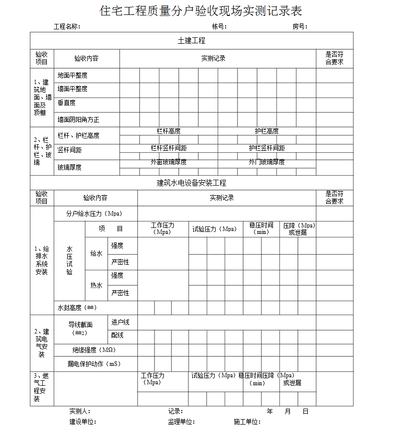 住宅工程質量分戶驗收現場實測記錄表